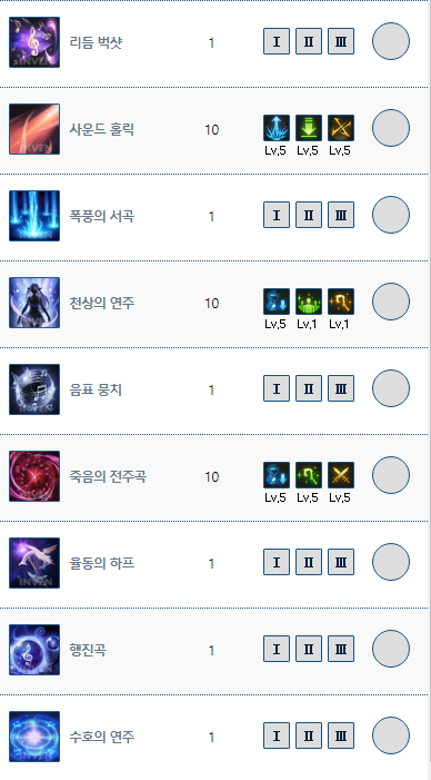 다음은 바드의 스킬트리인데요. 해당 스킬트리의 사용 스킬 포인트는 288 정도 됩니다.스킬 6개를 10렙씩 분배하고 폭풍의 서곡 스킬에 1레벨을 올려주는 스킬트리입니다. 그리고 불협화음의 1 트라이 포드는 해당 스킬트리를 사용해보고 편하신걸로 하시는게 좋습니다. 바드는 세레나데 스킬이라는 특수한 스킬 시스템을 보유하고 있는데 해당 스킬을 사용하기 위해서는 세레나데 버블이 필요합니다. 그리고 세레나데 버블은 최대 3개로 이루어져 있으며 세레나데 버블 1개를 소모하여 세레나데 스킬을 사용하기가 가능합니다.