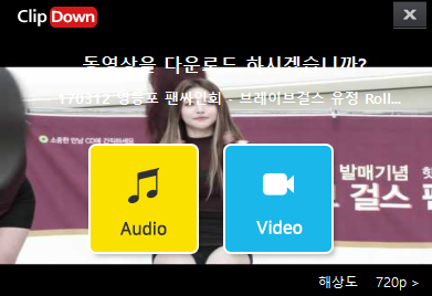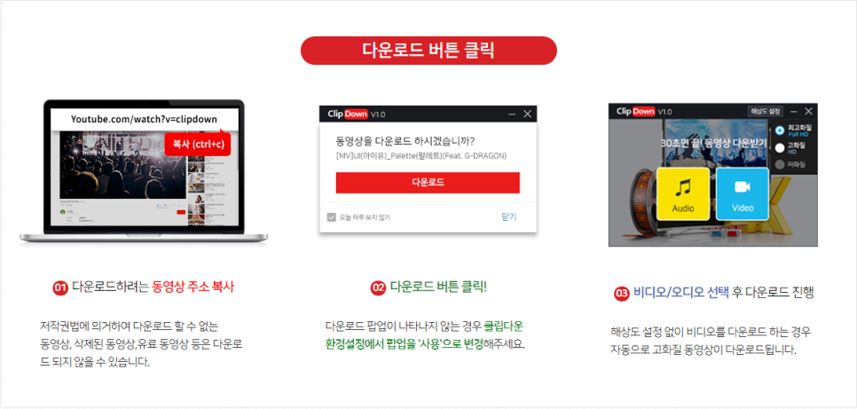 저작권법에 의거하여 다운로드 할 수 없는 동영상, 삭제된 동영상,유료 동영상 등은 다운로드 되지 않을 수 있습니다. 다운로드 팝업이 나타나지 않는 경우 클립다운 환경설정에서 팝업을 '사용'으로 변경해주세요. 해상도 설정 없이 비디오를 다운로드 하는 경우 자동으로 고화질 동영상이 다운로드됩니다.