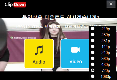 설치를 시작하게 되면 다음과 같이 동여상 다운로드에 필요한 정보를 확인중이라고 뜨는데요. 해당 창은 약 5초 내로 사라지고 다운로드 창으로 넘어가게 되니 별 신경 안쓰셔도 될듯 합니다. 자 이제 다음 창에서 제일 중요한 것은 해상도라고 생각되는데요. 음원 파일로 뽑으실분들은 해상도를 무시하고 오디오를 눌러 파일을 다운로드해주시면 됩니다. 그리고 영상 다운 시 기본적인 해상도는 720p로 설정되어있다는 점 참고 부탁드립니다.