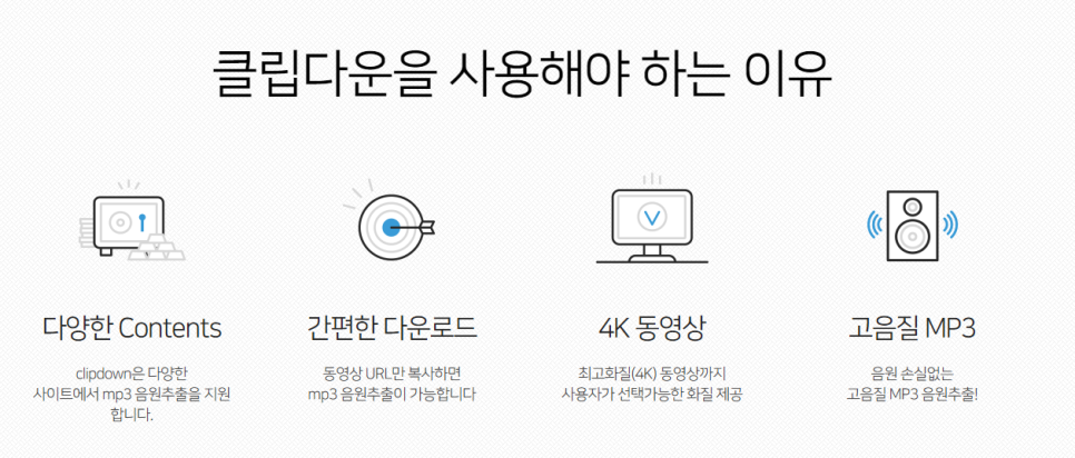현재 클립다운 프로그램은 다양한 사이트에서의 MP3 음원 추출을 지원하고 있습니다. 또한 동영상의 url만 복사하면 mp3 형태의 파일로 음원 추출이 가능하다고 합니다. 또한 최고 화질인 4k 동영상도 추출이 가능한데요. 사용자가 선택하여 원하는 화질로 파일을 제공받을 수 있습니다. 또한 MP3의 음질도 고음질이라 듣기 좋습니다.