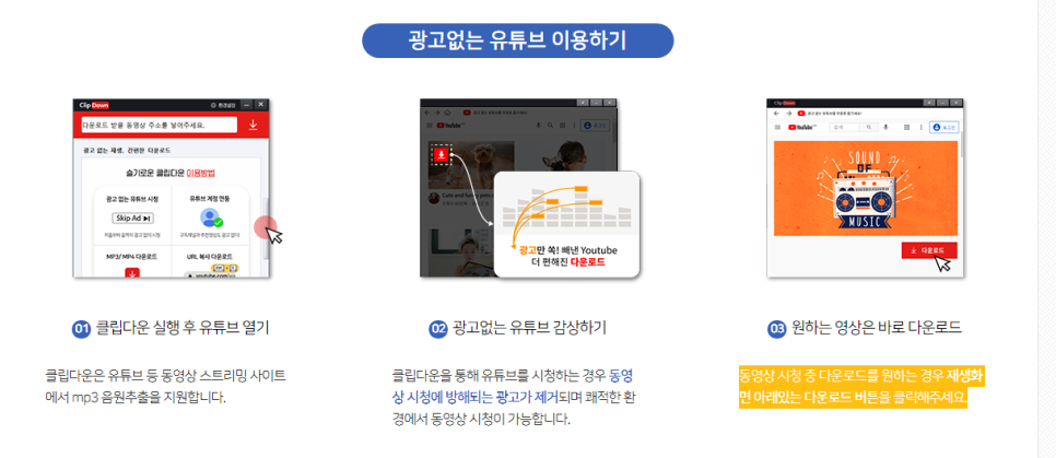 클립다운은 유튜브 등 동영상 스트리밍 사이트에서 mp3 음원추출을 지원합니다. 클립다운을 통해 유튜브를 시청하는 경우 동영상 시청에 방해되는 광고가 제거되며 쾌적한 환경에서 동영상 시청이 가능합니다. 동영상 시청 중 다운로드를 원하는 경우 재생화면 아래있는 다운로드 버튼을 클릭해주세요.