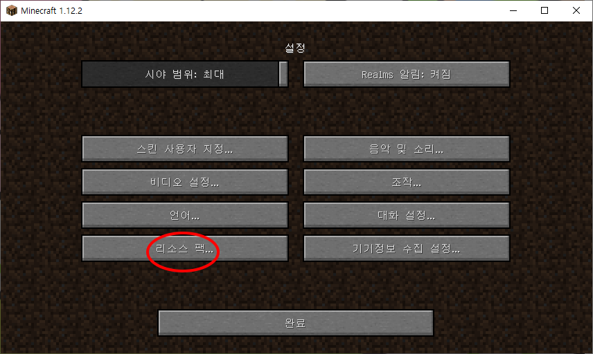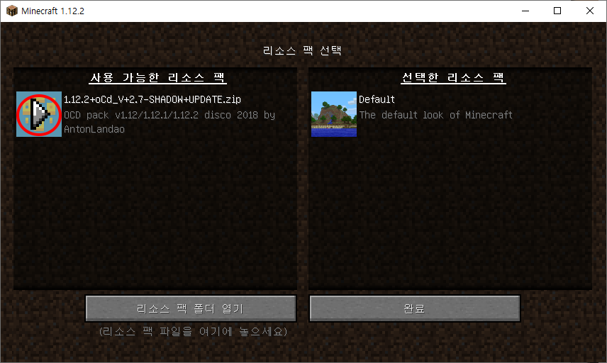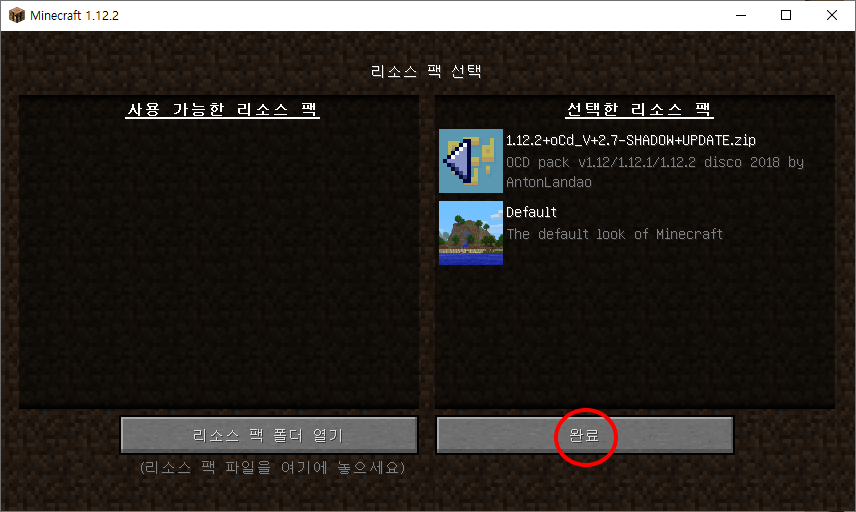 이후 완료 버튼을 클릭하면 리소스팩 적용이 끝납니다.