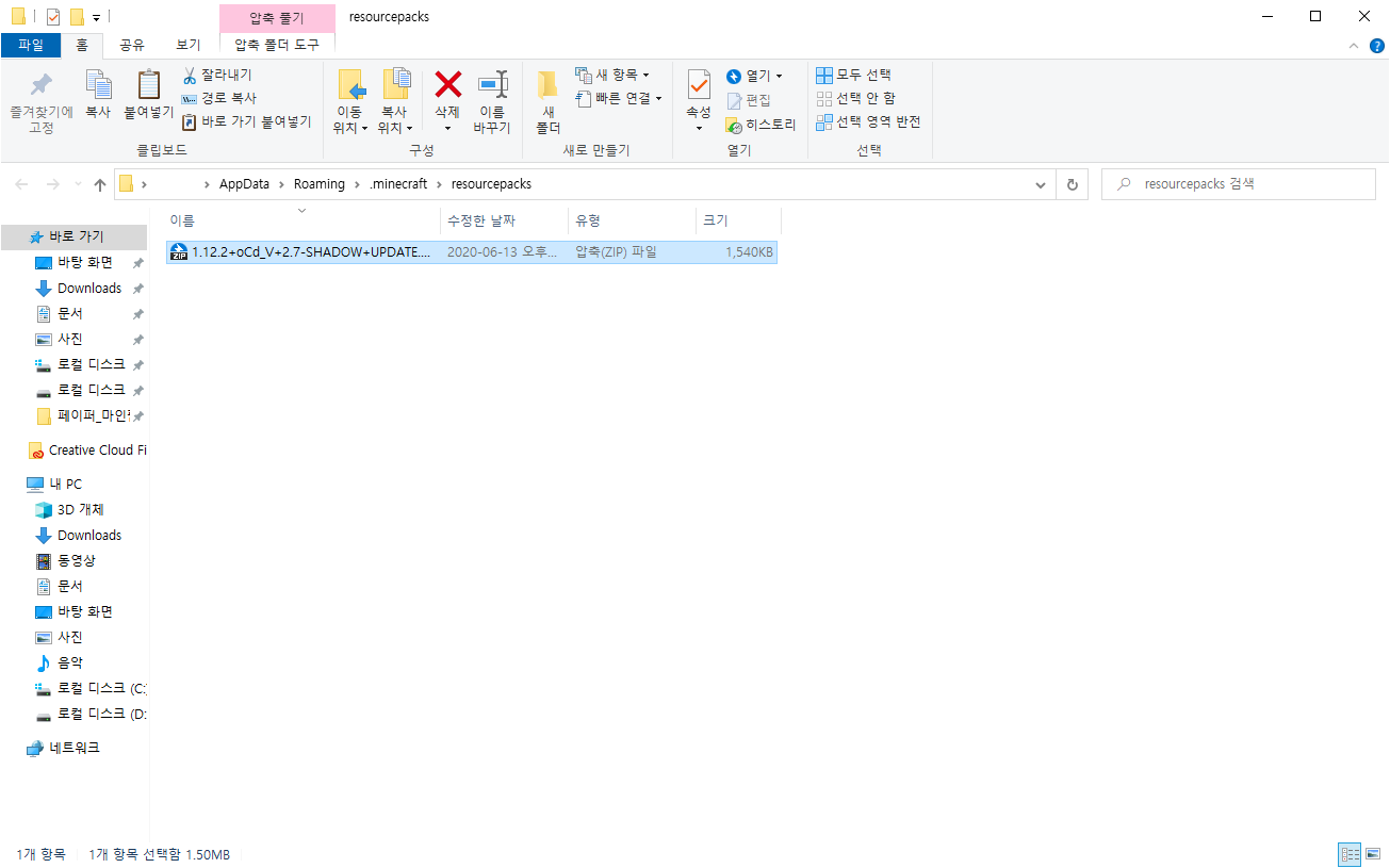 검색 후 열린 폴더에 리소스팩 파일을 넣어줍니다.