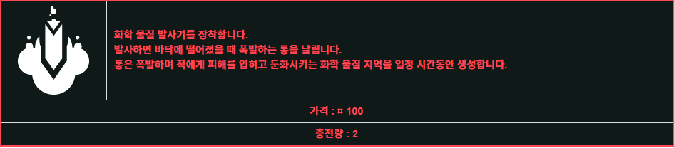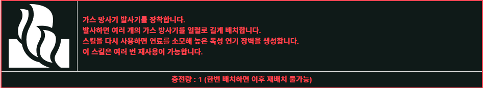 도트식 데미지이고 위협이 될 만큼 체력을 깎지는 못해서 연막탄 용도로 더 많이 사용된다.