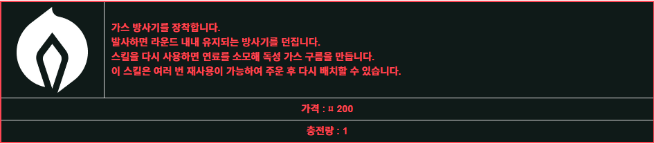 연료를 사용하여, 적의 시야를 가리고 피해를 입히는 원형의 독 구름을 생성합니다.