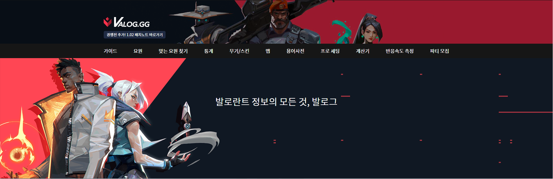 발로그 지지는 자신에게 맞는 요원 찾기,가이드,요원별 통계,프로게이머의 세팅,용어사전 등 여러가지 정보를 알려줍니다. 해당 사이트에서 알려주는 정보들은 대부분 유익하고 다른 사람들과 이야기를 나눌때 많이 사용하는 용어까지 알려주기 때문에 좋은것같습니다. 또한 파티 모집 메뉴도 존재하기 때문에 한번씩 클릭해서 발로란트를 같이 플레이할 유저를 구하는 것도 나쁘지 않을 것 같습니다. 여러가지 패치노트도 사이트에서 주기적으로 업로드하니 확인하시며 게임 플레이하시면 됩니다.
