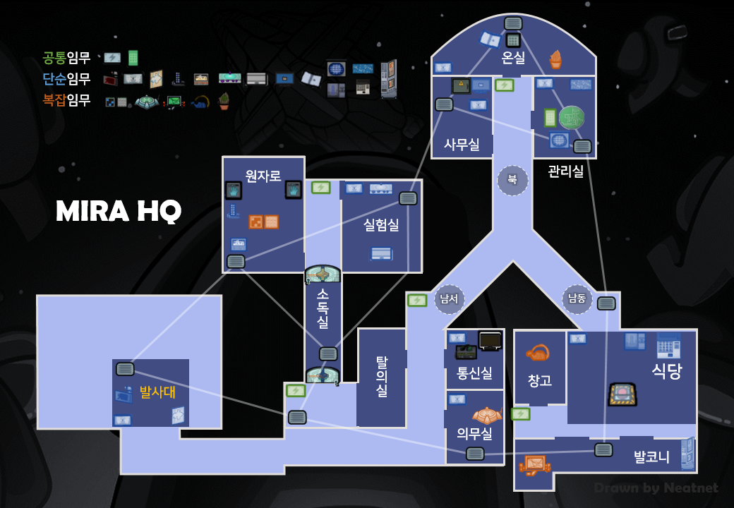MIRA HQ 맵은 2019년 8월에 공개된 맵입니다. 이 맵은 임포스터의 실력에 따라 승/패가 좌지우지됩니다. 맵이 크게 5부분으로 나누어져 있습니다. Y자 복도에 있는 도어로그를 이용해 지나간 플레이어의 동선을 얕게나마 확인하실 수 있습니다. 대부분의 구역에 환풍구가 존재하고 모두 연결돼있기 때문에 임포스터의 환풍구 유용한 사용 여부에 따라 난이도가 다르게 느껴질 수 있습니다. 그리고 사보타지로 문을 닫을 수 없기 때문에 밀실 살인을 하지 못합니다. 게다가 반드시 모든 구역이 시야가 한정된 구간(복도, 소독실)을 통과해야 하기 때문에 의무실, 통신실, 탈의실 주변에서 킬을 하지 않는 이상 경크 발생 확률이 적습니다.