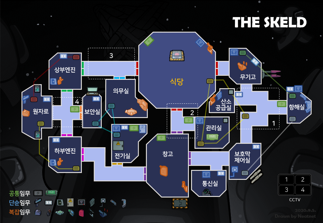 The Skeld 맵은 어몽어스에서 처음 출시된 맵이자 가장 기본적인 맵으로 우주선 내부를 테마로 하고 있습니다. 전체적으로 맵이 작으며 각 구역은 분리되어 있지만 구역을 연결하는 길이 비교적 짧아서 다른 구역을 많이 지나가며 돌아다니게 됩니다. 한곳에서 완료하는 임무보다는 여러 차례 구역을 옮겨 다녀야 하는 임무가 많습니다. 환풍구는 주요 인접 구역만 연결되어 있습니다. CCTV의 유용성이 다른 맵에 비해 상당하기 때문에 환풍구 사용량은 적습니다. 연결되어 있는 환풍구는 위의 사진에서 확인하시길 바랍니다.